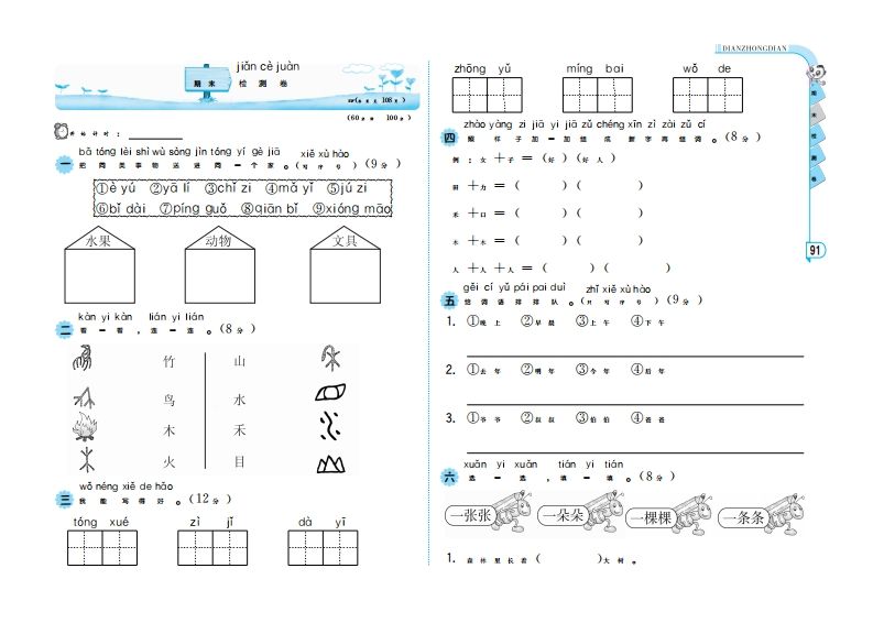 一年级语文册第6单元测试卷2-【免费下载-高清无水印】【语文电子版可打印】