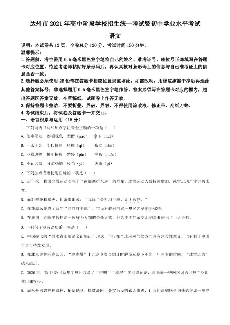 四川省泸州市2020年中 考语文试题-【免费下载】